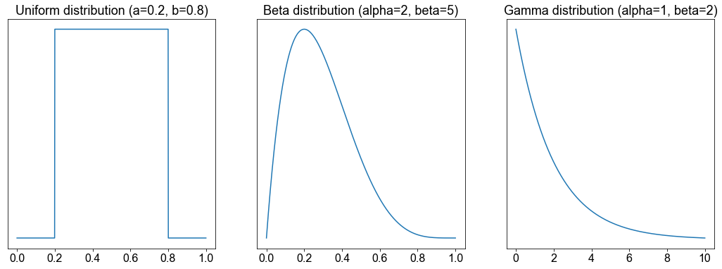 for col, distribution in enumerate([uniform(0.2, 0.6), beta(2, 5), gamma(1, 2)]):